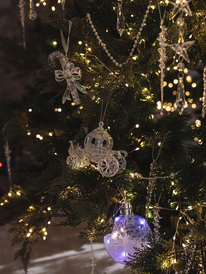Эта карета привносит в интерьер лёгкость и прозрачность зимнего утра. Её сияние отражает огни гирлянд, усиливая ощущение праздничного настроения и делая оформление ёлки более выразительным и изящным.