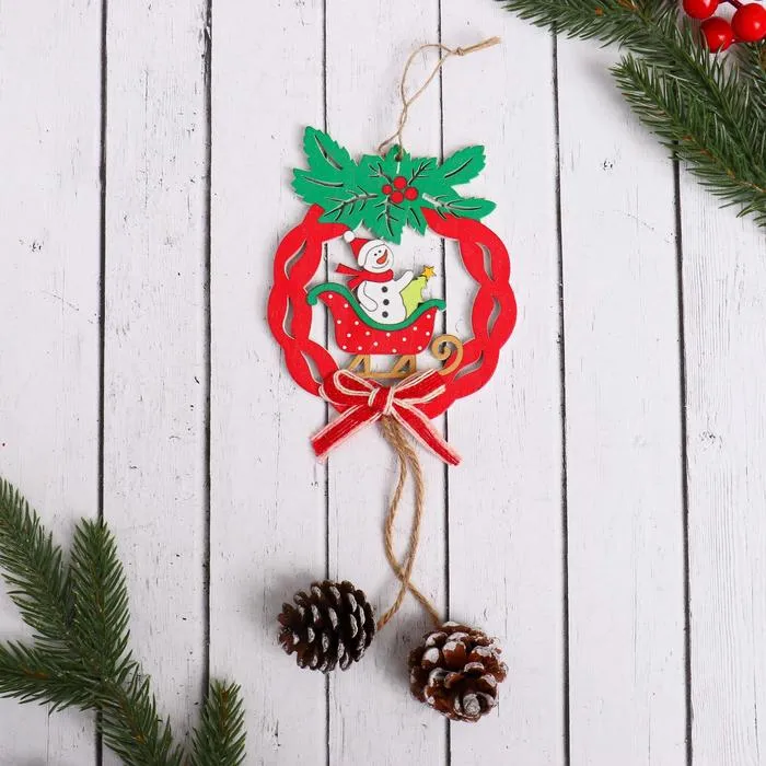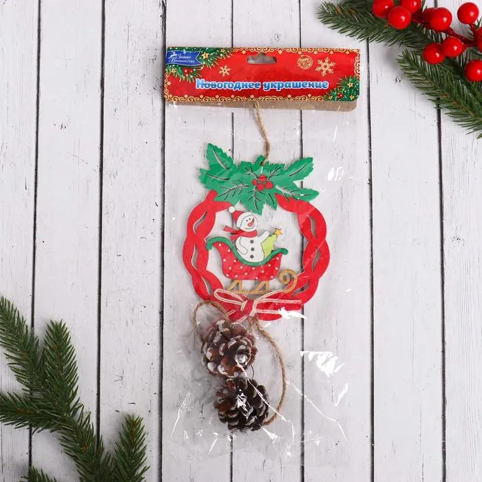 Ёлочная игрушка "Рождественский венок с шишками" снеговик в санках 10х23 см