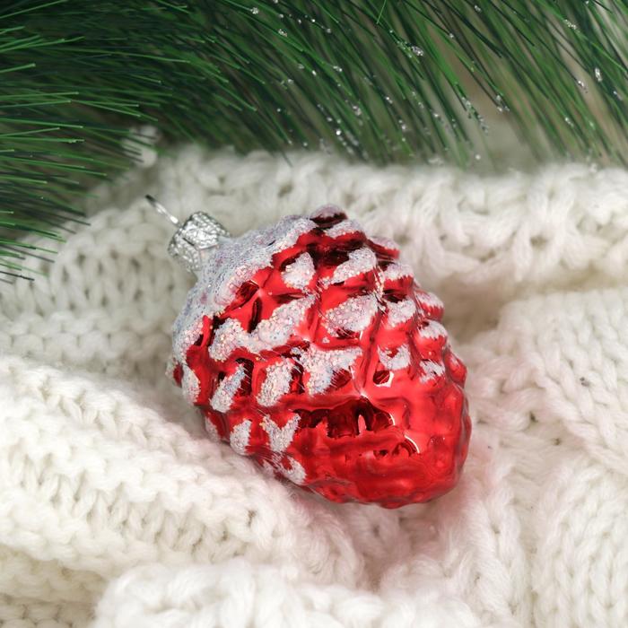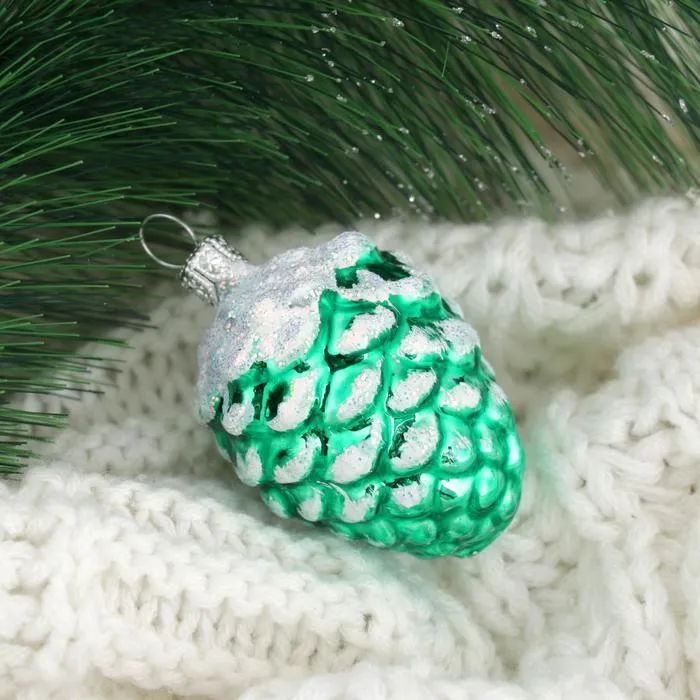 - Форма — шишка, отсылка к природным мотивам и зимним традициям украшения ёлки.