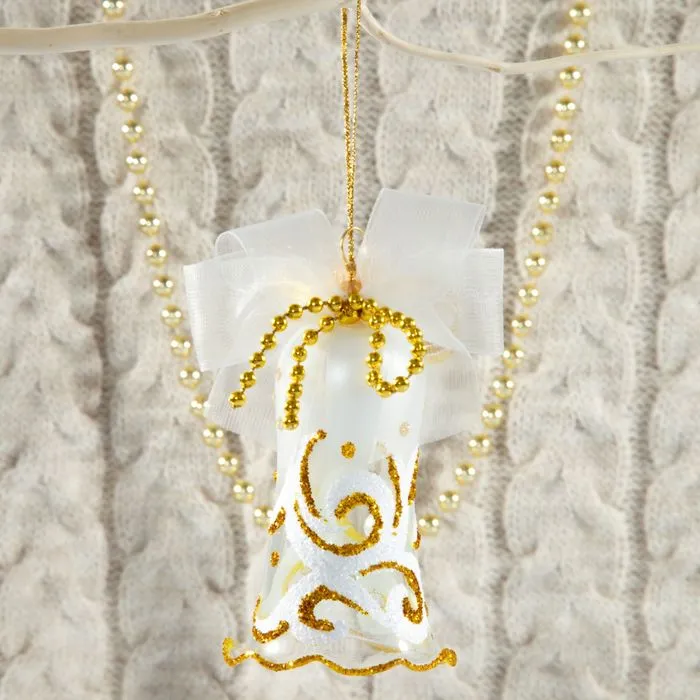 Ёлочная игрушка «Узорный колокольчик» — это стильный и светлый элемент для украшения новогодней ёлки. Изделие высотой 8,2 см выполнено из стекла с рисунком и оформлено в виде колокольчика — символа зимнего торжества и добрых традиций. Украшение создано в духе советского дизайна с отсылкой к датскому минимализму, классике и шебби-шик — решение для тех, кто ценит свет, форму и атмосферу праздника.