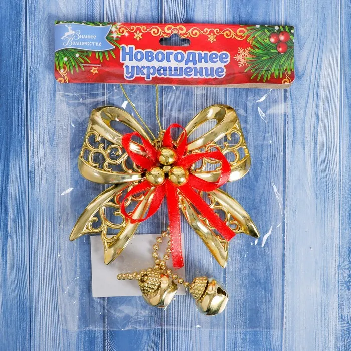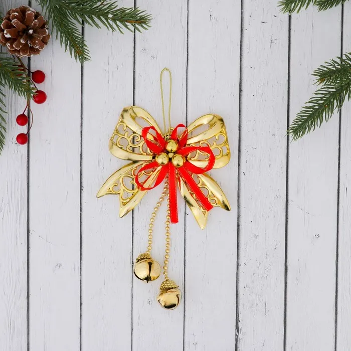 Ёлочная игрушка «Зимнее волшебство. Бантик с бубенчиками» пластик, 11,5х10 см, золотисто-красный — Характеристики