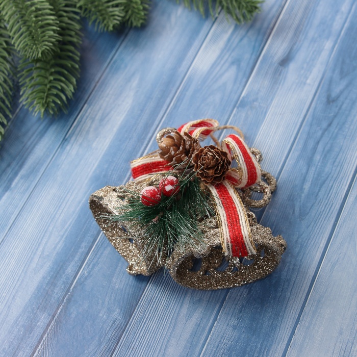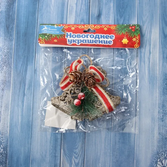 Ёлочная игрушка «Зимнее волшебство. Колокольчик блеск бантик объём» пластик, 8х10,5 см, золото — Характеристики