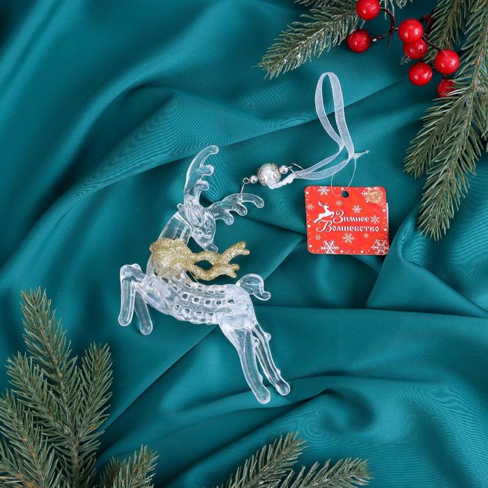 Ёлочная игрушка «Зимнее волшебство. Олень в прыжке с шарфом блеск» пластик, 13х12 см, прозрачно-золотой