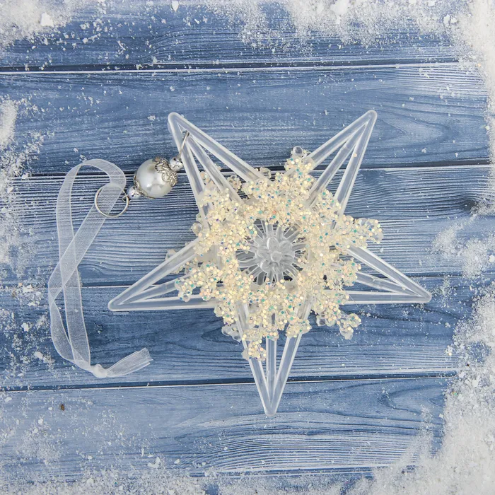 Прозрачная ёлочная звезда из пластика — изящное украшение в классическом и ар-деко стилях. Её резной дизайн подчёркивает игру света и тени, создавая атмосферу зимней сказки на вашей ёлке.