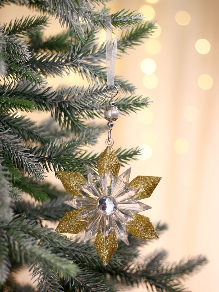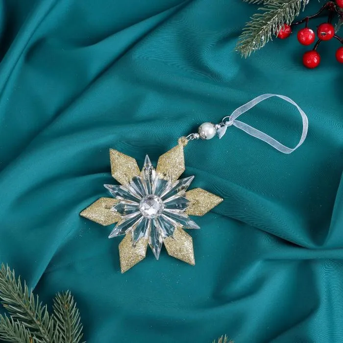 Пусть зимнее сияние засияет на вашей ёлке. Ёлочная игрушка «Снежинка с блеском» — это образ морозного узора, застывшего в свете праздничных гирлянд. Золотистый пластик с резными линиями создаёт эффект лучистого света — строго, ярко и по-настоящему новогодне.