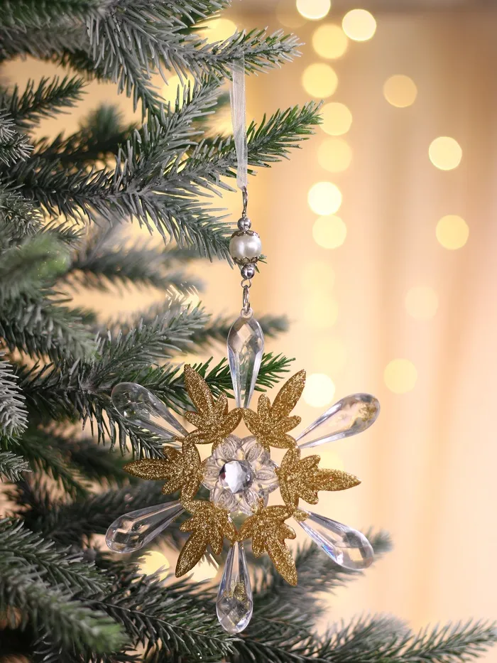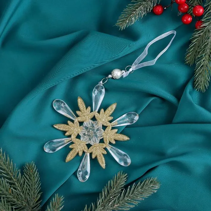 Прозрачно-золотая снежинка с резным узором — изящное украшение для новогодней ёлки, сочетающее классику, ар-деко и барочный стиль. Её прозрачная структура и золотистый оттенок создают эффект сияния, подчёркивая праздничную атмосферу и добавляя изысканность в оформление.