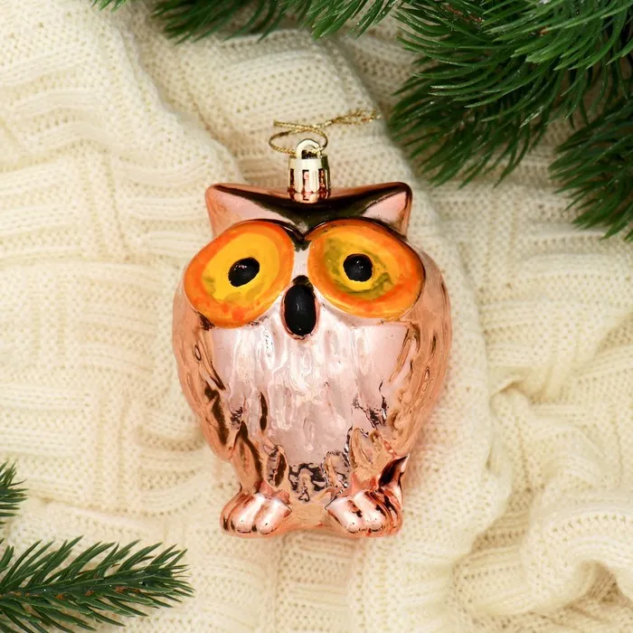 Ёлочная игрушка в виде совы — это необычный и запоминающийся элемент новогоднего декора. Фигурка выполнена в ретро-стиле с резными деталями, создающими эффект старинной игрушки. Она органично впишется в разные оттенки праздничного оформления — от традиционной ёлки до современного интерьера.