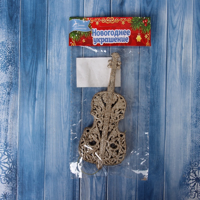 Золотистая ёлочная фигурка в форме виолончели станет изящным акцентом в праздничном оформлении. Однотонное покрытие подчёркивает стилистику ар-деко и новогоднего барокко, добавляя классический шарм и торжественность в интерьер. Лёгкий пластик обеспечивает удобство использования и сохранность украшения.