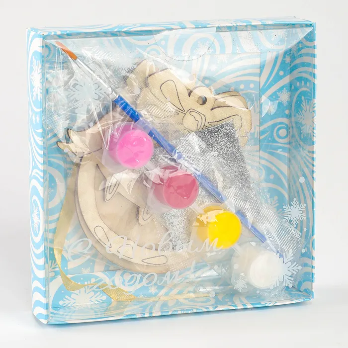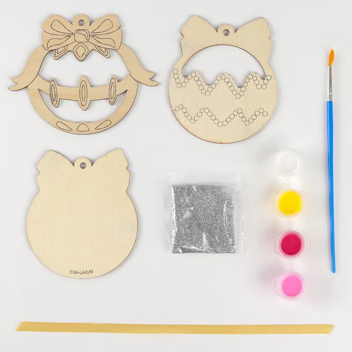 - В комплект входят деревянные заготовки, краски и кисточка, блёстки и лента.