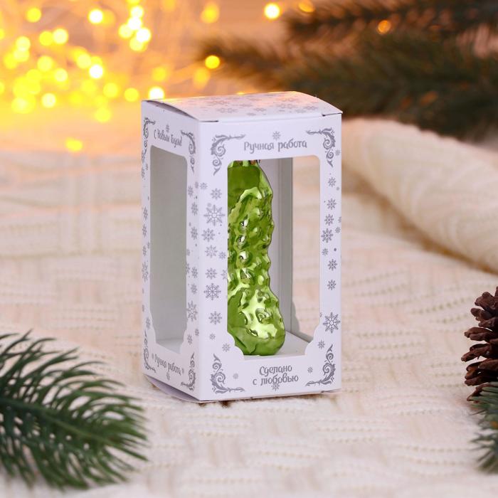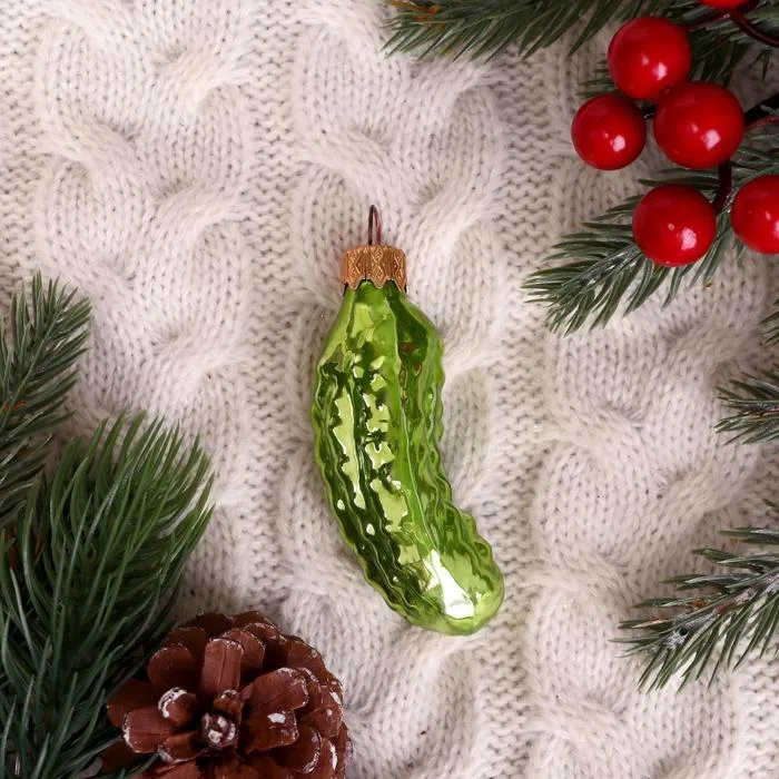 Стеклянный огурчик станет нежным акцентом в новогоднем декоре. Зелёное украшение в форме овоща отражает традиции праздника.