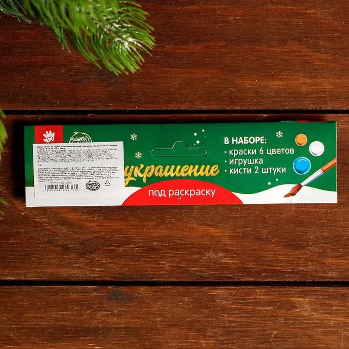 В наборе: краски 6 цветов, 2 кисти, деревянная основа-подвеска.