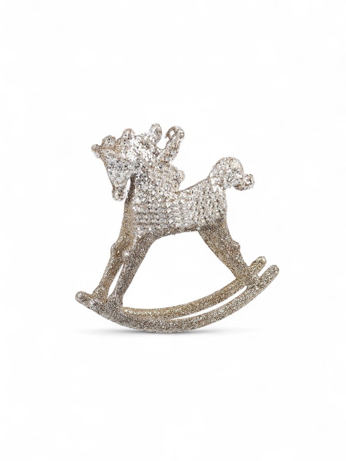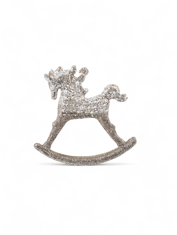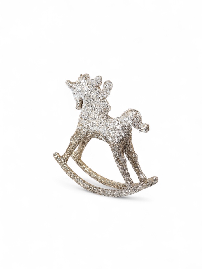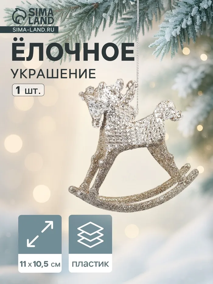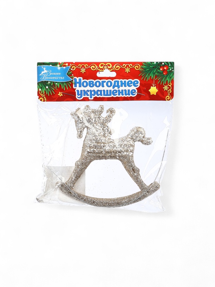 Золотистая ёлочная фигурка в виде лошадки-качалки размером 10,5×11 см добавит традиционный и тёплый акцент в праздничное оформление. Её изящный силуэт и мягкий блеск оттенка подчёркивают уют и детскую ностальгию, делая ёлку более выразительной и живой. Лёгкий материал обеспечивает удобство размещения и долговечность украшения.