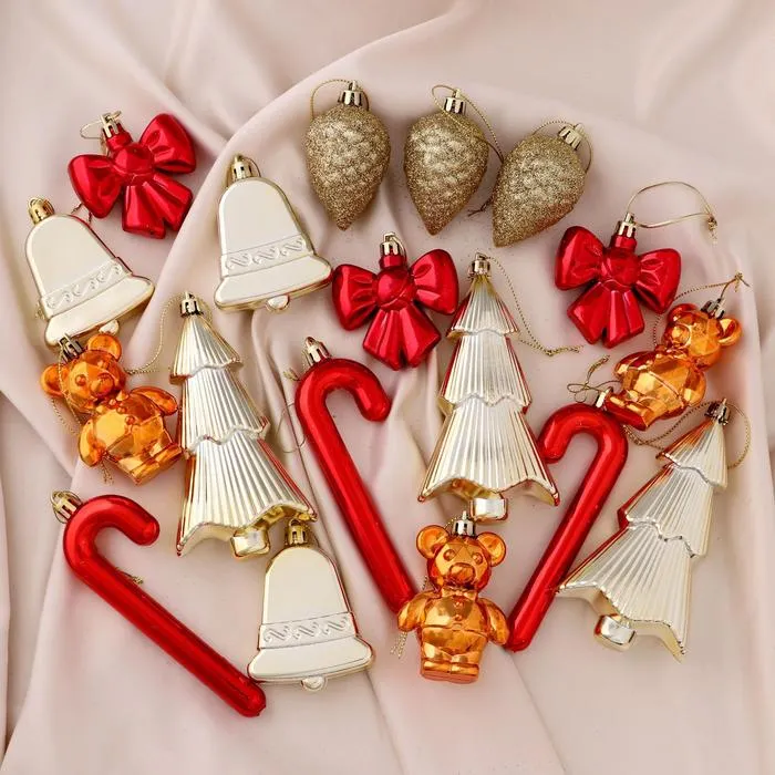 Создайте праздничную атмосферу – золото-красные новогодние игрушки в стиле фьюжн и советского дизайна! Золото-красные украшения на елку – набор из 18 аксессуаров, сочетающих теплоту советских праздников и современность фьюжн-стиля. Их разноцветные оттенки добавляют глубину композиции, не требуя дополнительных акцентов.