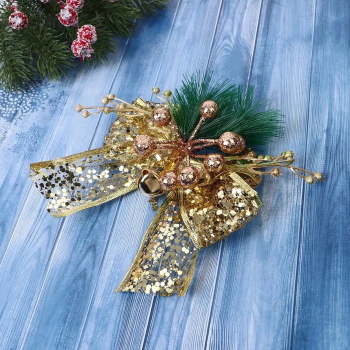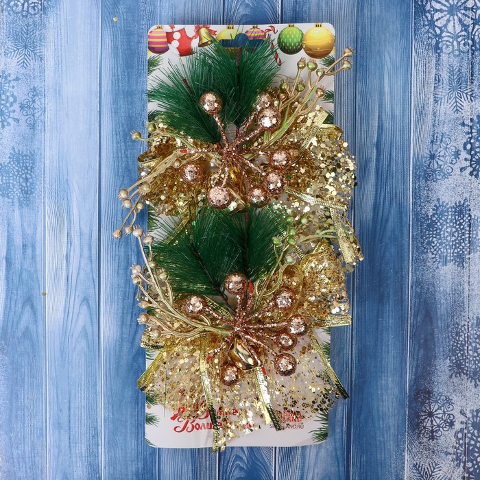 Ёлочные игрушки 2 шт. «Зимнее волшебство. Еловая композиция» пластик, бант блеск, ягодки, 13х12 см, золото