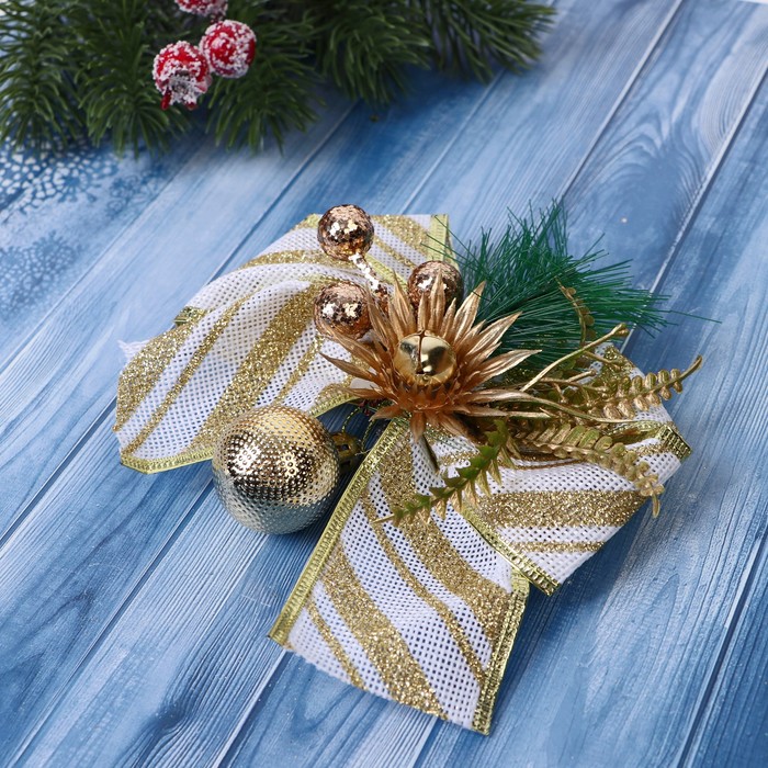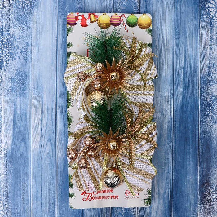 Ёлочные игрушки 2 шт. «Зимнее волшебство. Еловая композиция» пластик, бант с полосками, 13х12 см, бело-золотой — Характеристики