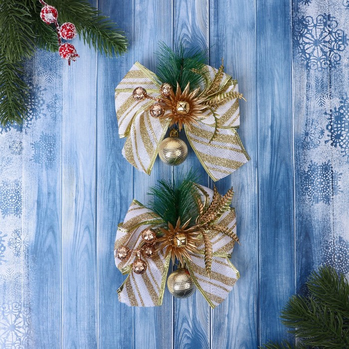Ёлочные игрушки 2 шт. «Зимнее волшебство. Еловая композиция» пластик, бант с полосками, 13х12 см, бело-золотой — Характеристики