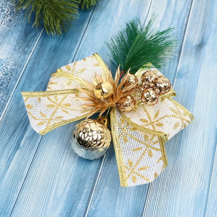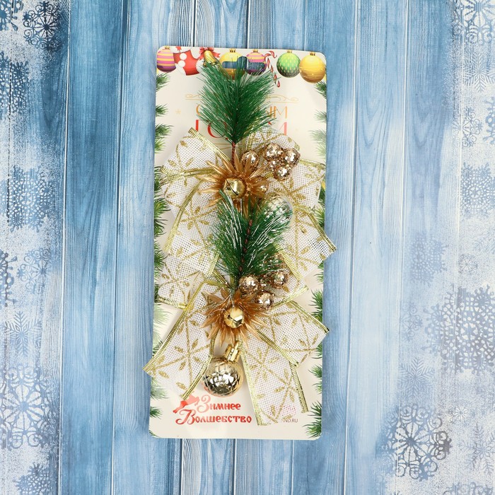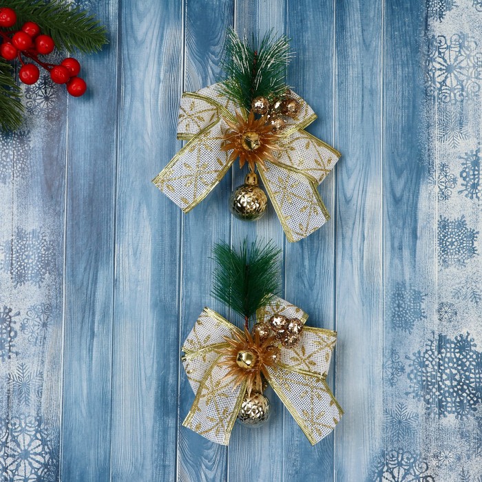 Ёлочные игрушки 2 шт. «Зимнее волшебство. Еловая композиция» пластик, бант с принтом, 11х13 см, бело-золотой — Характеристики