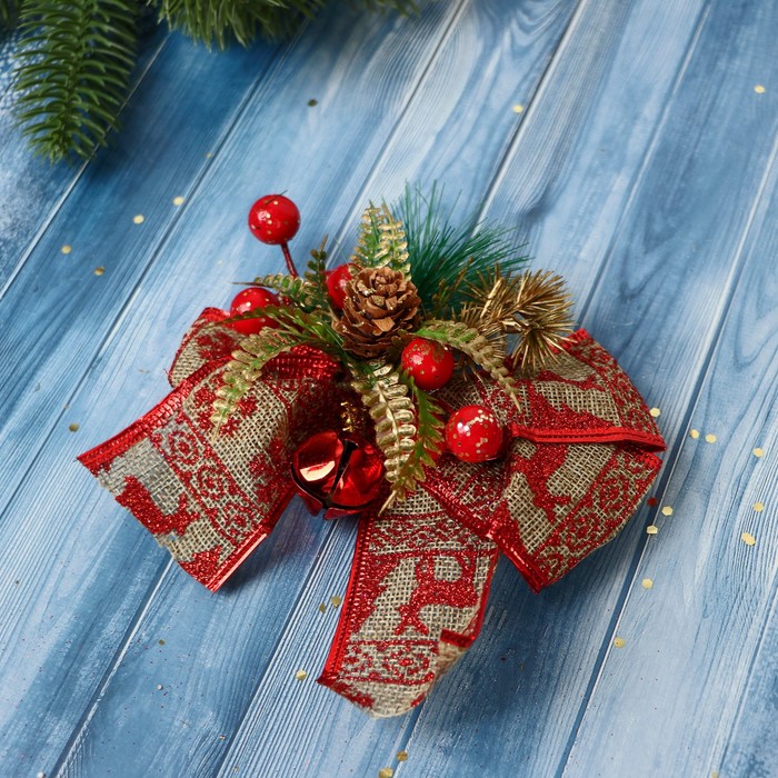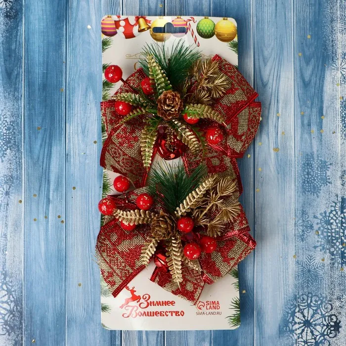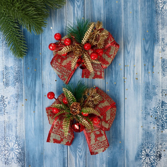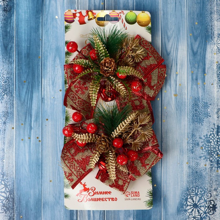 Ёлочные игрушки 2 шт. «Зимнее волшебство. Еловая композиция» пластик, бант с принтом, 12х11 см, красный — Характеристики