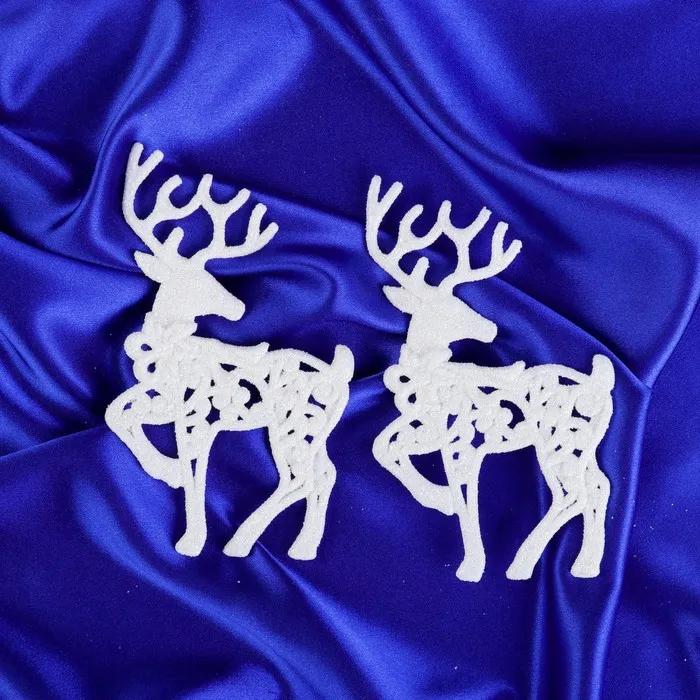 Новогодний набор из двух ёлочных игрушек в виде белых оленей — это изысканный акцент для праздничного декора. Фигурки высотой 12 см с резным узором передают грацию и спокойствие зимнего животного, создавая атмосферу умеренной роскоши без лишней яркости. Подходят как для традиционной ёлки, так и для современного новогоднего оформления.