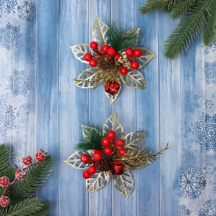 Ёлочные игрушки 2 шт. «Зимнее волшебство. Праздничные цветы» пластик, ягоды, 12 см, золото — Характеристики
