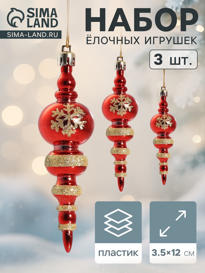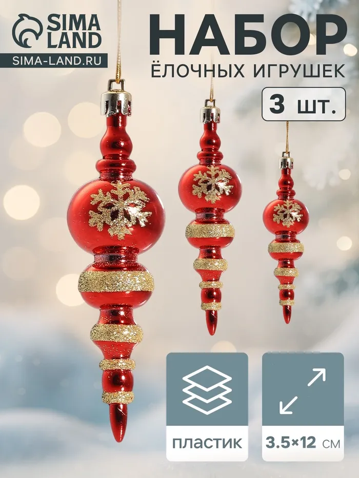 Ёлочные игрушки 3 шт. «Сосулька со снежинкой», 3.5×12 см, красный — Характеристики