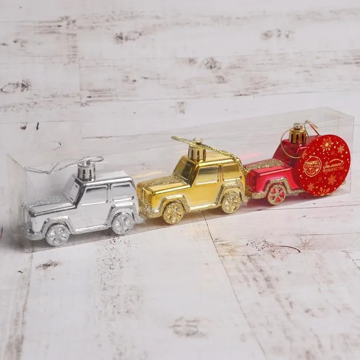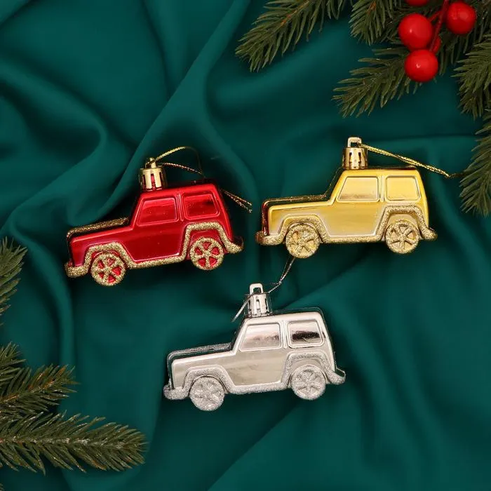Добавьте динамики в праздничный декор – разноцветные игрушки-транспорты в стиле советского дизайна и новогоднего барокко! Новогодние игрушки-машинки – набор из 3 аксессуаров, сочетающих ностальгию по советским праздникам и роскошь барокко. Их размер – 7,5×3,5 см, что делает каждую заметным акцентом без перегрузки композиции.