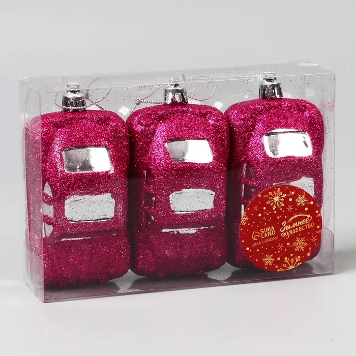 Ёлочные игрушки 3 шт, «Зимнее волшебство, Машинки» пластик, 9х3,5 см, розовый — Характеристики