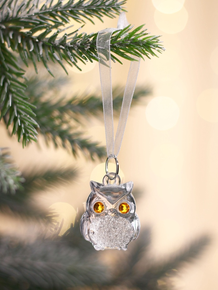 Набор из трёх прозрачных ёлочных фигурок в форме сов — лаконичное украшение для новогодней ёлки в стиле ар-деко. Миниатюрные птицы придают праздничному декору лёгкость и изящество, подчёркивая атмосферу зимнего праздника.