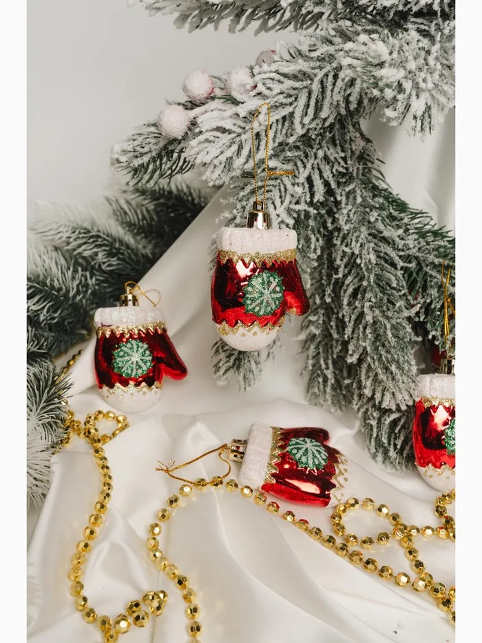 Эти украшения напоминают о зимних вечерах и семейных традициях, добавляя ёлке выразительности и характерного колорита. Их яркий цвет и узор создают атмосферу тепла и радости в новогодние дни.