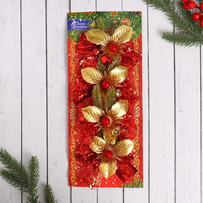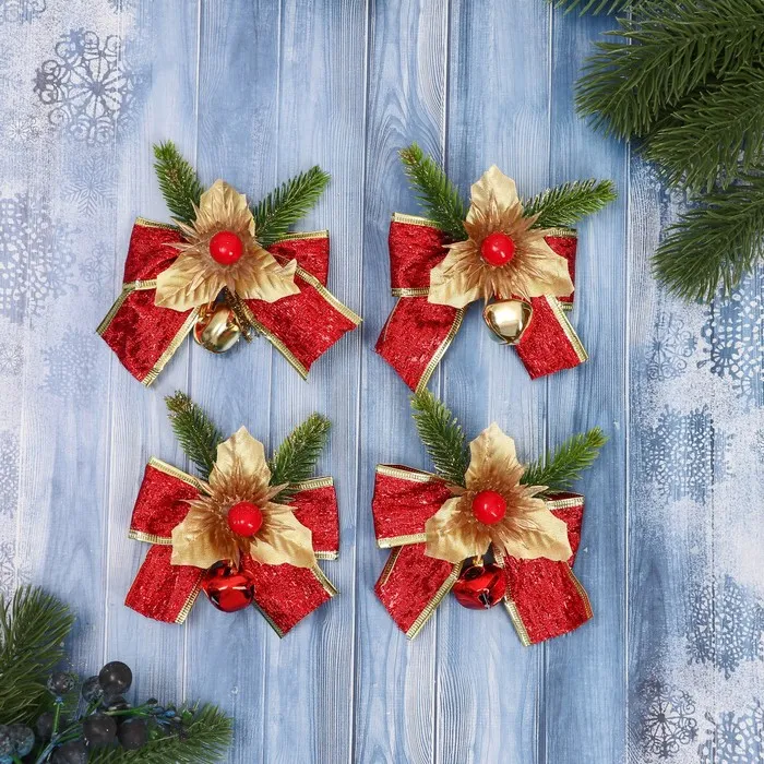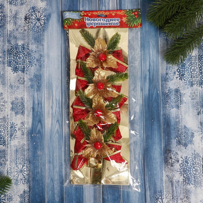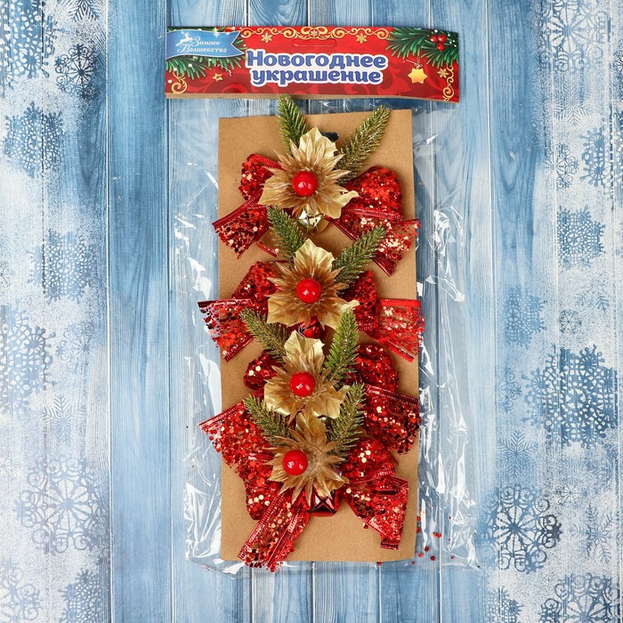 Ёлочные игрушки 4 шт. «Зимнее волшебство. Зимнее чудо» пластик, бантик блеск цветок, 10х8 см, красный — Характеристики