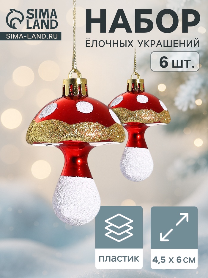 Ёлочные игрушки 6 шт. «Грибочек» 4.5×6 см, золото — Характеристики