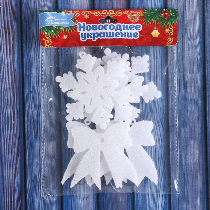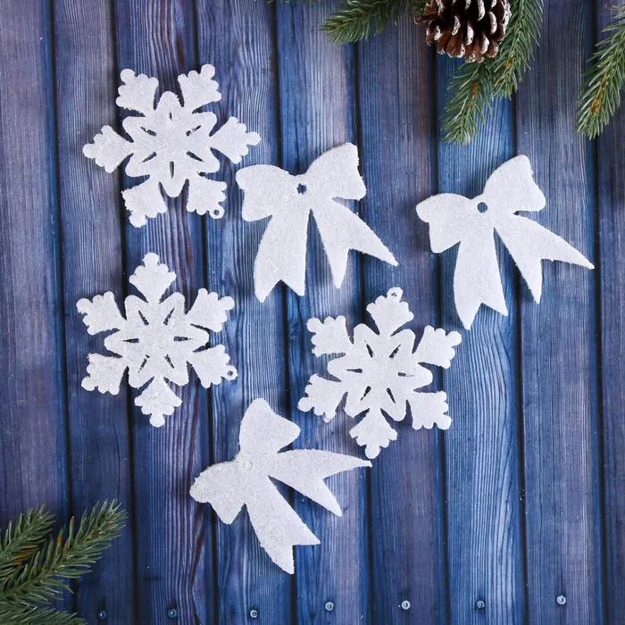 Ёлочные игрушки 6 шт. «Зимнее волшебство. Снежинки и бантики - мерцание» пластик, 7х6 см, белый — Характеристики