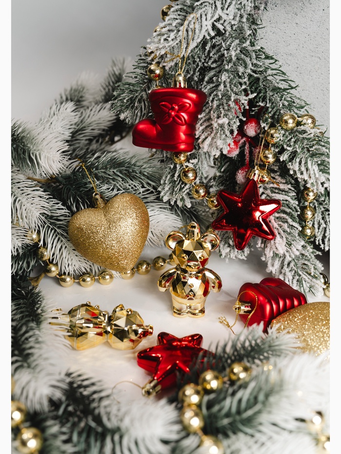 Создайте праздничную атмосферу – золото-красный новогодний ассорти в стиле барокко и советского дизайна! Разноцветные ёлочные игрушки – набор из 8 резных аксессуаров, сочетающих пышность барокко и ностальгию по советским праздникам. Их яркие оттенки добавляют глубину композиции, не требуя дополнительных акцентов.