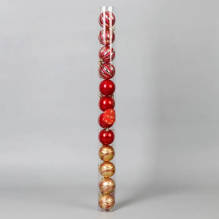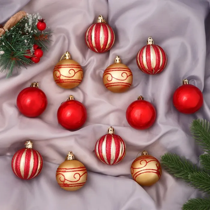 Новогодние шары с узором — это праздничный декор, сочетающий ретро-стилистику и современный вкус. Набор из 12 пластиковых игрушек диаметром 5 см оформлен в золотисто-красной гамме с рисунком в виде полос и орнаментов. Такие игрушки подчёркивают атмосферу новогоднего барокко и советского дизайна, создавая ощущение доброй традиции и зимнего торжества.