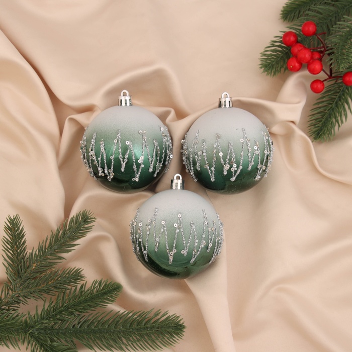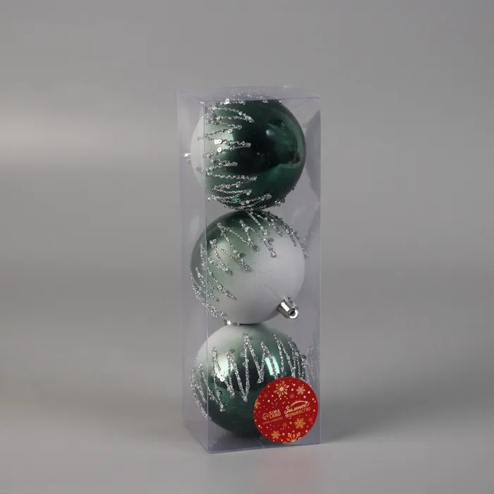 Новогодние шары «Акселл» — это крупные украшения для тех, кто создаёт праздничный декор с акцентом на стиль. В наборе 3 пластиковых игрушки диаметром 8 см с рисунком в зелёно-белых тонах — сочетание цветов напоминает покрытые инеем ветви и добавляет ёлке зимней свежести. Эти шары органично вписываются в интерьер в стиле шебби-шик, где важны уют и эстетика.