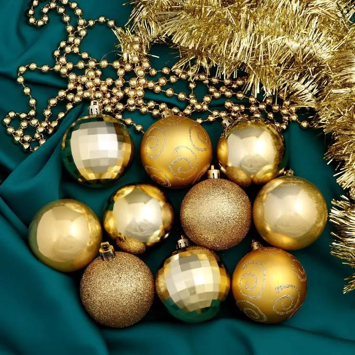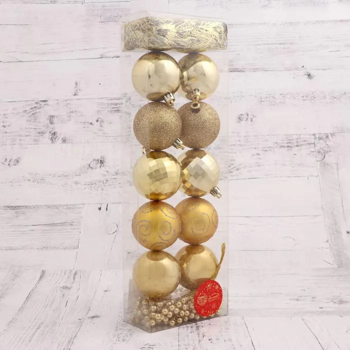 Наполните дом атмосферой оптимизма и благополучия в канун Нового года. Ведь золотой цвет символизирует изобилие и богатство. Потому ёлочные игрушки «Ариозо», шары новогодние, пластик, набор с бусами и мишурой, 12 шт., золотистый как нельзя лучше подойдут для праздничного интерьера.