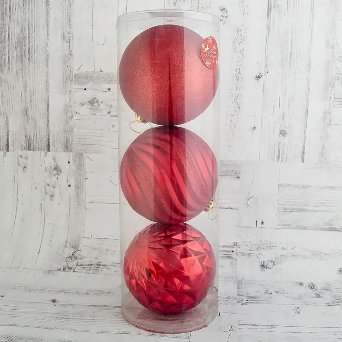 Набор из трёх ёлочных шаров в насыщенном красном цвете станет великолепным дополнением к вашему новогоднему декору. С диаметром 15 см, эти игрушки идеально подходят для создания яркого и праздничного настроения на ёлке. Изготовленные из прочного пластика, они обеспечивают долговечность и лёгкость, что делает их удобными для использования и хранения.