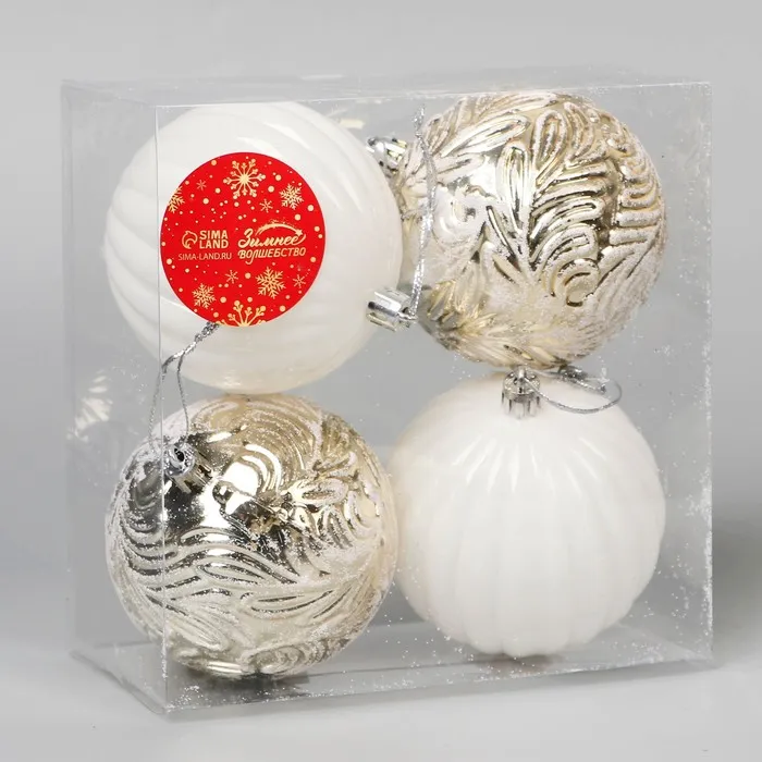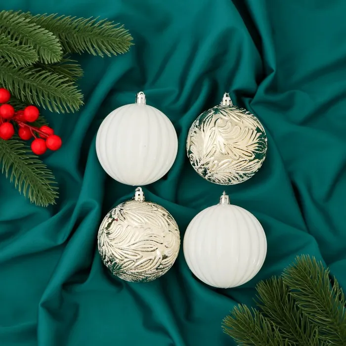 Ёлочные игрушки «Авива», шары новогодние, набор 4 шт., d=8 см, листья, белый/золотистый — Характеристики