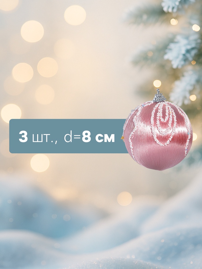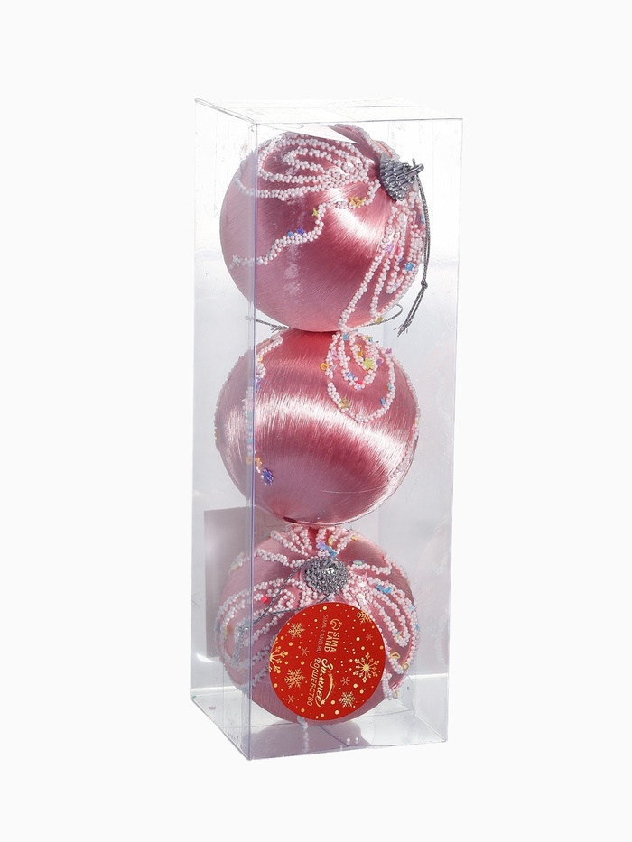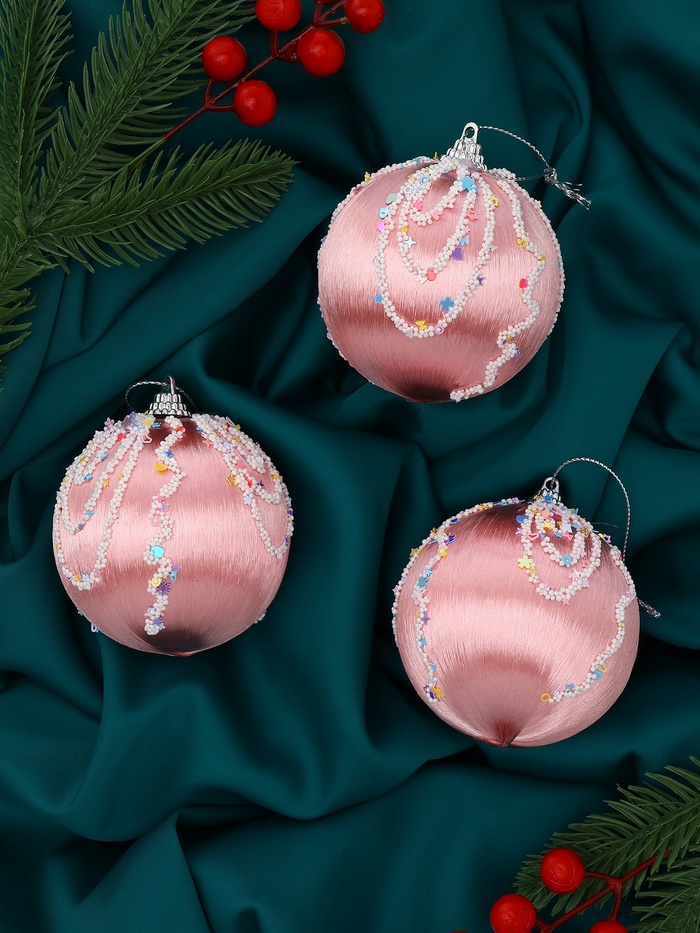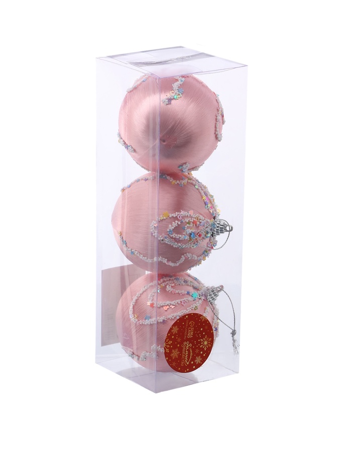 Набор из 3 розовых ёлочных шаров диаметром 8 см с нежным рисунком. Лёгкие пластиковые украшения добавляют в новогодний интерьер мягкий цветовой акцент и создают атмосферу праздника.