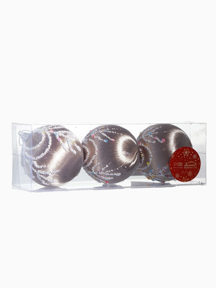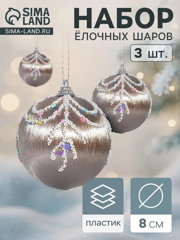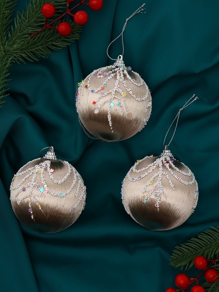 Набор из 3 золотистых ёлочных шаров диаметром 8 см с изящным рисунком. Лёгкие пластиковые шары гармонично дополняют праздничный декор, создавая тёплую атмосферу новогоднего торжества.