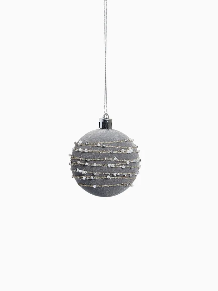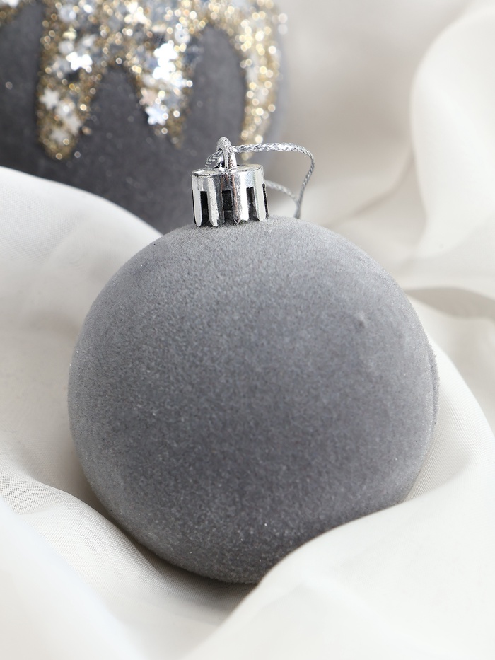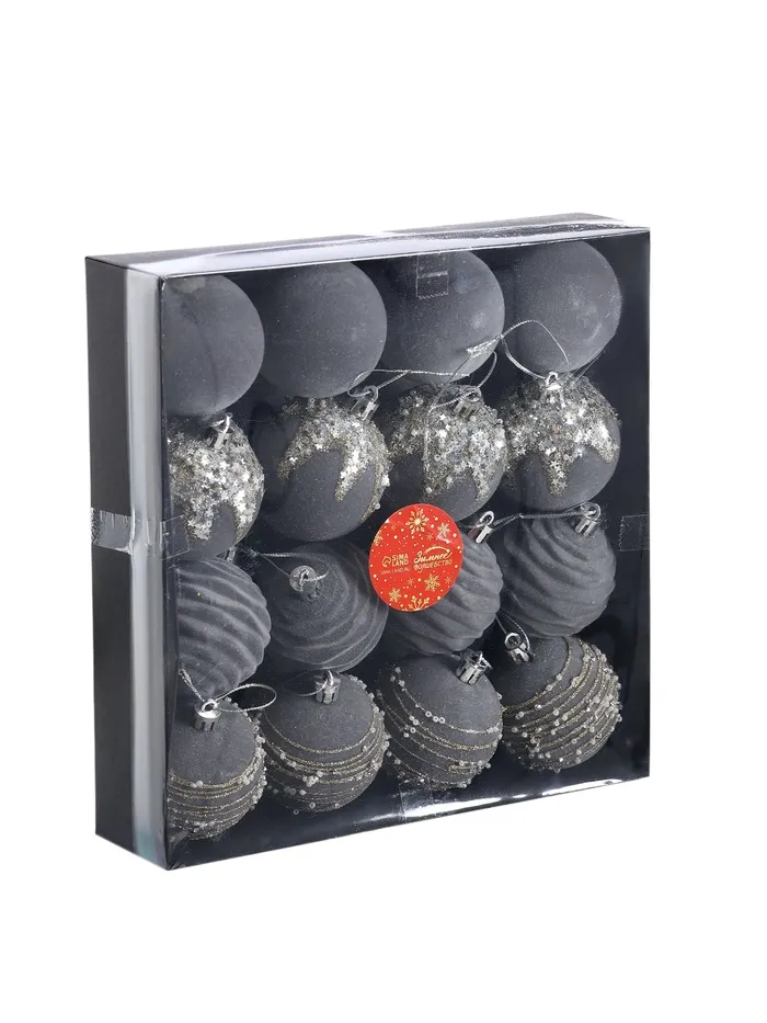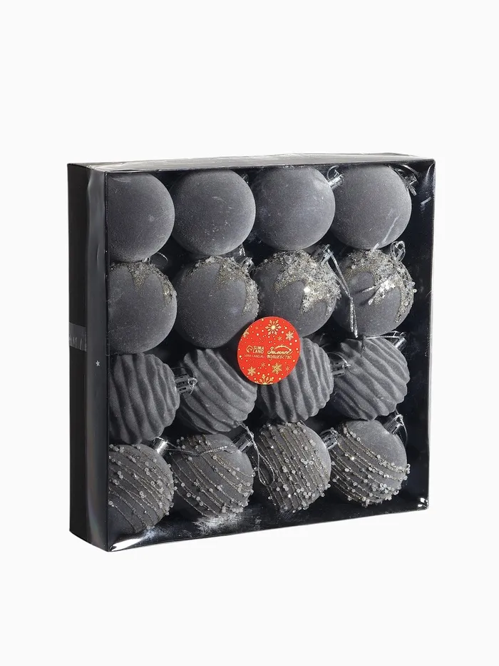 Набор из 16 серых ёлочных шаров диаметром 6 см с изящным рисунком в стиле бархатного маскарада. Пластиковые украшения создают сдержанную и элегантную атмосферу новогоднего декора.