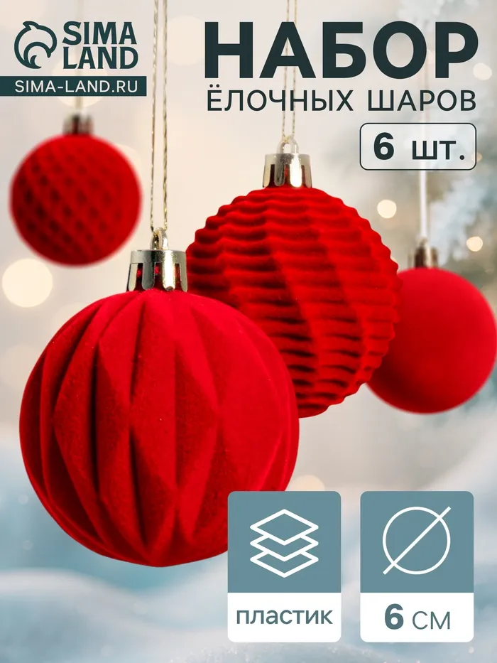 Ёлочные игрушки «Бархат. Время праздника», шары новогодние, d=6 см, 6 шт., классик, красный — Характеристики