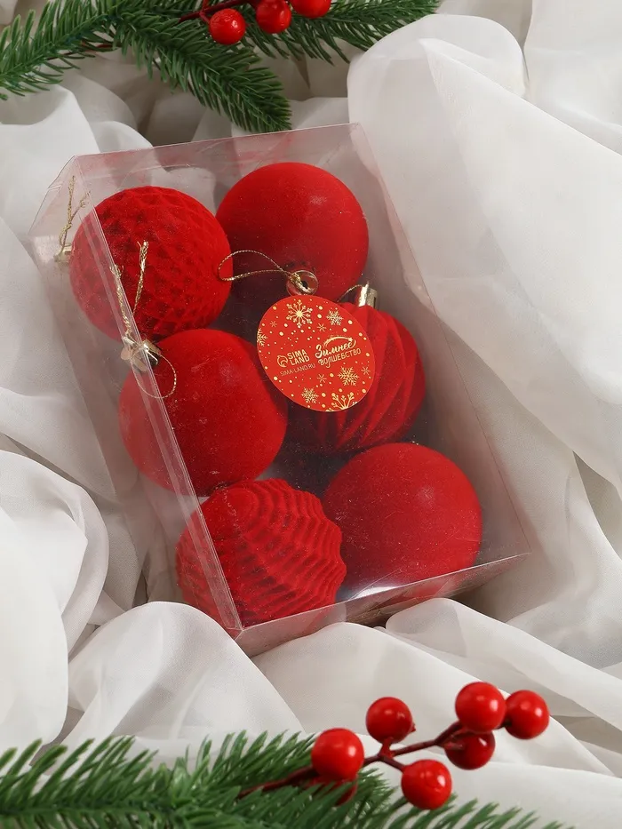 • В комплекте 6 шаров одинакового размера и насыщенного красного оттенка.