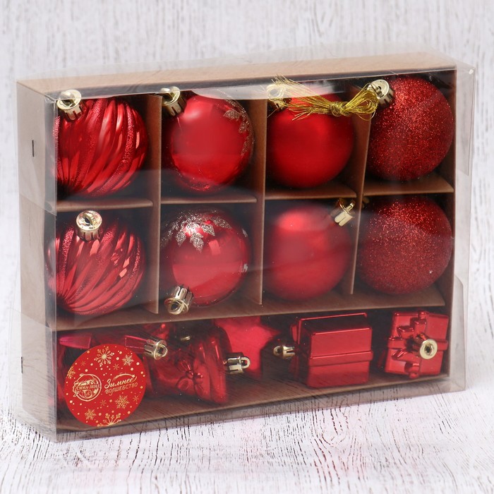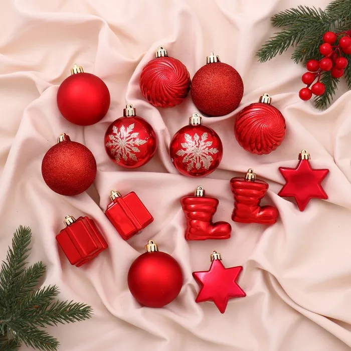 Ёлочные игрушки «Дейзи», шары новогодние, набор 14 шт. (8 шаров, 6 фигурок), красный — Характеристики
