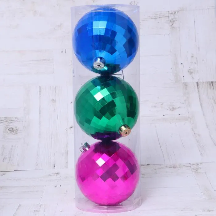 Набор из трёх ярких новогодних шаров диаметром 15 см станет ярким акцентом на вашей ёлке, придавая ей неповторимый стиль и атмосферу праздника. Эти шары в стиле фьюжн с однотонным дизайном идеально подойдут для создания оригинального новогоднего декора. Микс цветов добавляет живости и динамики, создавая ощущение веселья и радости.
