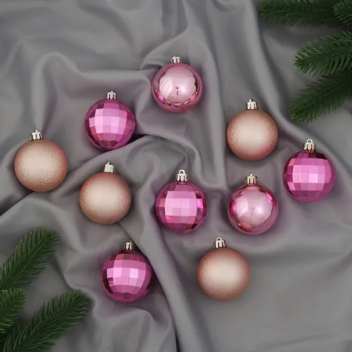 Набор из десяти розовых миниатюрных ёлочных шаров диаметром 5 см объединяет элементы советского, скандинавского, фьюжн и шебби-шик стилей. Однотонные пластиковые украшения создают гармоничное и разнообразное праздничное оформление.