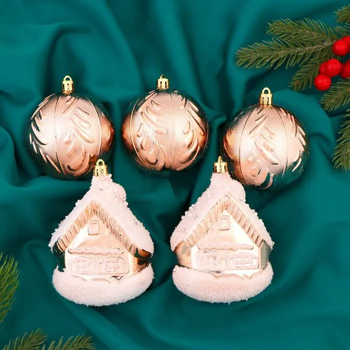 Ёлочные игрушки «Домик», набор 5 шт. (3 шара d=7.5 см, 2 домика), золото — Характеристики