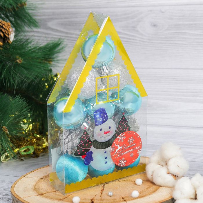 Ёлочные игрушки «Домик», шары новогодние, набор 12 шт. (9 шаров,3 шишки), серебристый/голубой — Характеристики
