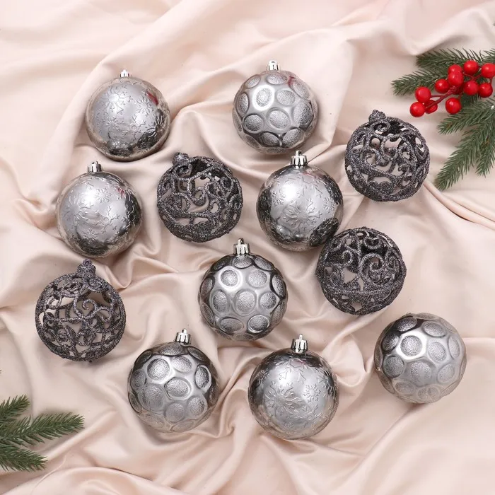- 12 пластиковых шаров с матовой поверхностью в сером цвете.