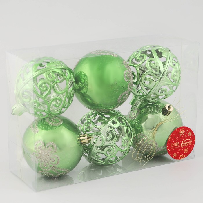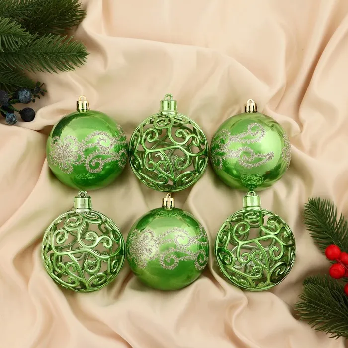 Новогодние шары «Эстер» — это крупные украшения для тех, кто ценит детали в праздничном декоре. Зелёный цвет и резной узор добавляют ёлке объёмности и зимней сказочности, а 6 пластиковых игрушек диаметром 8 см становятся яркими акцентами оформления. Набор подходит для скандинавского минимализма и фьюжн-стиля, где важна не пышность, а выразительность формы.